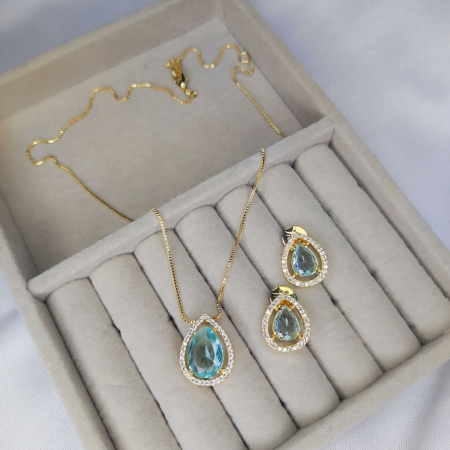 • CONJUNTO BRINCO E COLAR VENEZIANA GOTA COM ZIRCÔNIA VERDE